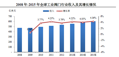 從中長期來看,影響閥門行業(yè)的下游行業(yè)擴(kuò)張的主要因素,包括不斷增長的能源需求、全球人口的持續(xù)增加以及發(fā)展中國家的城市化、工業(yè)化進(jìn)程并沒有因金融危機(jī)而發(fā)生根本性改變。目前全球各主要經(jīng)濟(jì)體都已經(jīng)進(jìn)入經(jīng)濟(jì)復(fù)蘇周期(根據(jù)國際貨幣基金組織的統(tǒng)計(jì)和預(yù)測(cè)數(shù)據(jù),2010年、2011年和2012年全球經(jīng)濟(jì)增長實(shí)現(xiàn)恢復(fù)性增長,增長率分別為5.3%、3.9%和3.2%,2013年和2014年全球經(jīng)濟(jì)年增長速度預(yù)計(jì)為2.9%和3.6%)。閥門行業(yè)自2010年也開始走向復(fù)蘇,根據(jù)McIlvaine的調(diào)查和預(yù)測(cè)數(shù)據(jù),2010年、2011年和2012年,全球工業(yè)閥門行業(yè)收入分別為492.24億美元、513.17億美元和532.61億美元,增長率恢復(fù)至3.77%、4.25%和3.79%,2013年-2015年全球工業(yè)閥門行業(yè)的預(yù)計(jì)銷售增長率將分別達(dá)到4.22%、4.05%和4.36%,呈現(xiàn)穩(wěn)步上升的增長態(tài)勢(shì)。