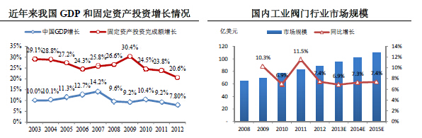 2003年-2012年,中國經(jīng)濟(jì)總體上保持快速增長的發(fā)展態(tài)勢(shì),平均GDP增長率為10.45%,全社會(huì)固定資產(chǎn)投資完成額增長率平均為26.11%。國內(nèi)閥門行業(yè)整體上保持持續(xù)增長的態(tài)勢(shì),景氣程度高于全球水平。2008年全球金融危機(jī)爆發(fā)后,國內(nèi)閥門行業(yè)增速下滑,但在2010年又恢復(fù)到較高的增長水平。根據(jù)McIlvaine的分析,預(yù)計(jì)2013年至2015年,中國工業(yè)閥門行業(yè)市場規(guī)模的增長率還將穩(wěn)定在7%左右,遠(yuǎn)高于全球的工業(yè)閥門行業(yè)增長速度。
